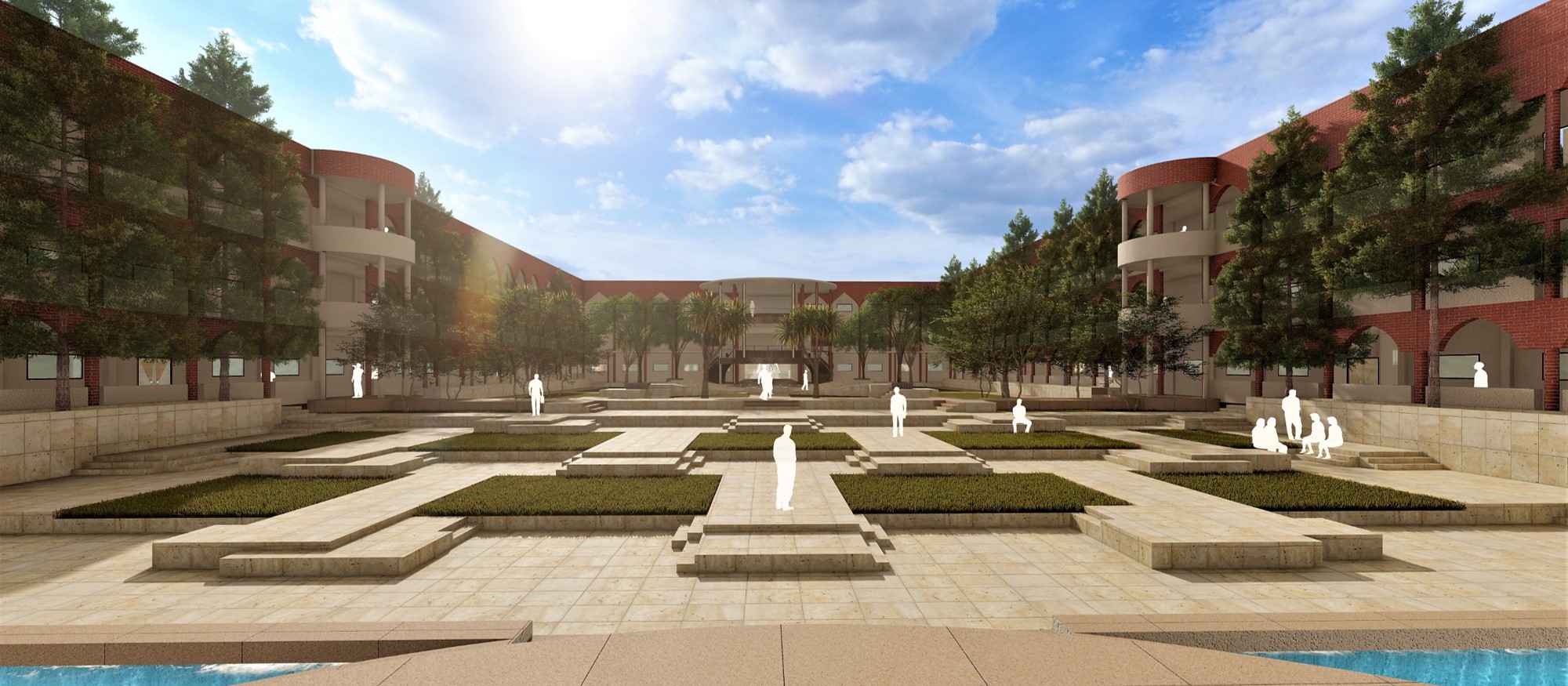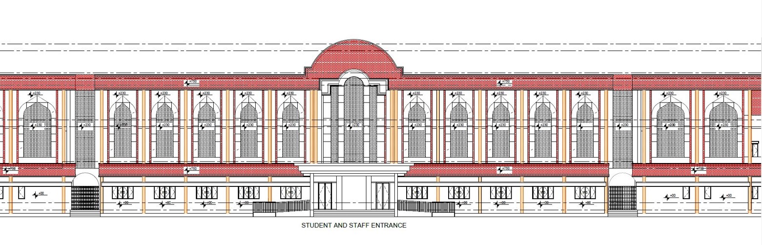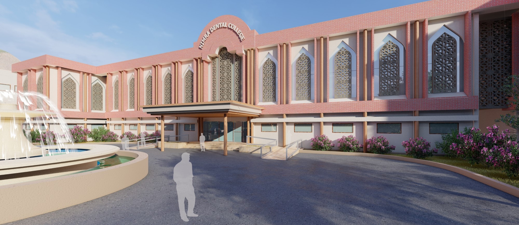 Nimra Dental College embodies an architectural narrative characterized by experiential spatial transitions, starting from the fountain and culminating at the floating stage, both intricately woven into a sacred axis defined by the presence of water. This axis serves as the connective thread orchestrating a hierarchy of spatial volumes, progressing from open to semi-covered, then to double-height, and finally to enclosed spaces. Echoing the principles of temple architecture,
